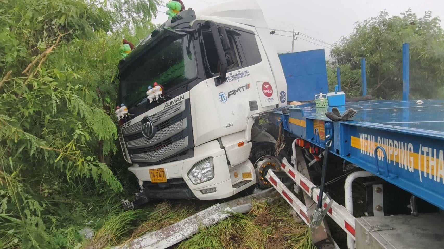 Pattaya, Thailand – At 8:00 AM on May 24th, 2025, a serious accident involving an 18-wheeler truck occurred on Sukhumvit Road in Pattaya as heavy rainfall made roads dangerously slippery. The Sawang Boriboon Rescue Center in Pattaya received reports of a truck veering off the road at the U-turn section in Moo 5 in Khao Mai Kaew. Rescue volunteers were promptly dispatched to the scene, accompanied by The Pattaya News team.
