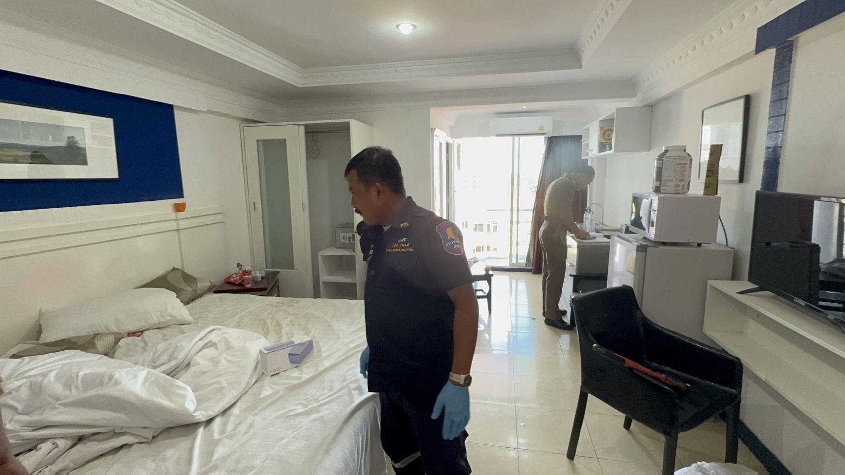 The first case was reported at 2:00 PM, when Pol. Lt. Col. Saijai Khamjulla, an investigator at Pattaya City Police Station, was alerted to a deceased foreign man in a room on the fifth floor of a condominium behind South Pattaya’s Tukcom. The exact name of the condo was withheld by police stressing the ongoing investigation.
