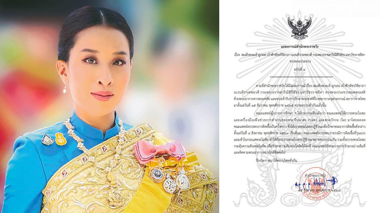 The Bureau of the Royal Household on Friday issued its fourth statement on the health of Her Royal Highness Princess Bajrakitiyabha Narendira Debyavati, stating that the Princess has been diagnosed with a severe bloodstream infection and is receiving full medical care.