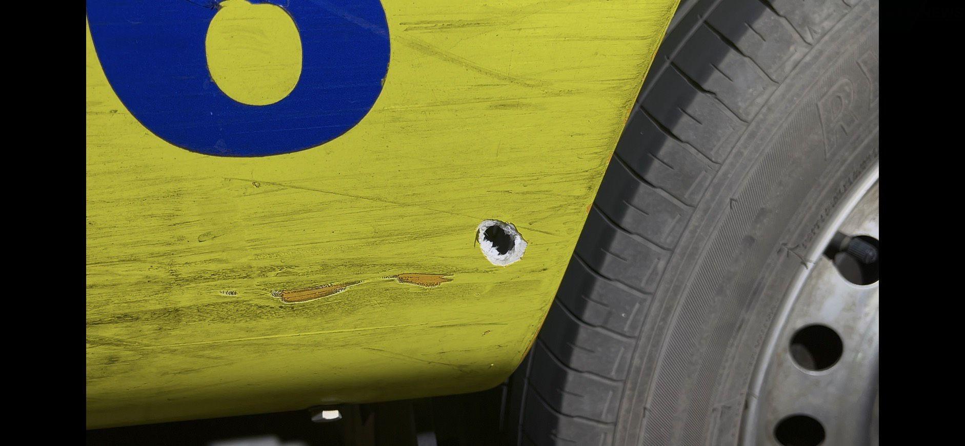 At the location, officers found the damaged suspect vehicle, a white Isuzu D-Max pickup truck with Bangkok registration plates abandoned on the shoulder of the road. Approximately 100 meters away, the motorway rescue vehicle (Bangkok plate 3ฒก 4049) had sustained bullet damage to its right rear wheel and wheel arch.